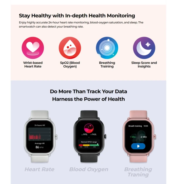 • However, the real magic of the GTS 3 Pro shines through in its health and fitness capabilities. This smartwatch is your dedicated health companion, offering comprehensive features like blood-oxygen saturation measurement, all-day heart rate monitoring, stress level tracking, sleep analysis, and even menstrual period tracking for female users. For fitness enthusiasts, it’s a game-changer, with over 100 sports modes for activities like walking, running, cycling, strength training, yoga, and more.
