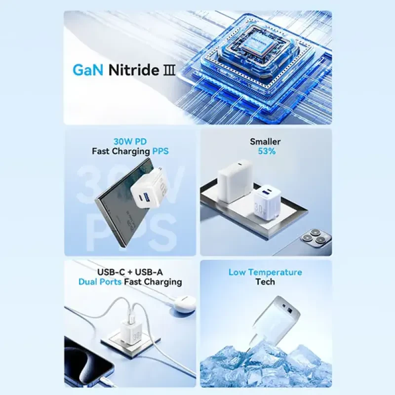 is the perfect solution for fast, efficient, and safe charging in a compact design. Thanks to advanced GaN (Gallium Nitride) technology, it delivers up to 30W of power while staying cooler and smaller than traditional chargers. Equipped with both USB-C and USB-A ports, it’s versatile enough to charge smartphones, tablets, and other devices at optimal speed.