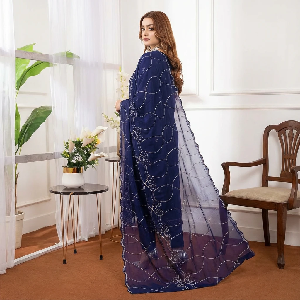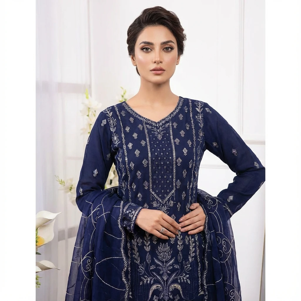 Midnight Aura হলো এক অসাধারণ লাক্সারি থ্রি পিস, যা আধুনিক এলিগ্যান্স ও ক্লাসিক সৌন্দর্যের নিখুঁত সমন্বয়। গভীর নেভি ব্লু রঙের এই পোশাকটি ফরমাল অনুষ্ঠান, বিয়ের দাওয়াত কিংবা বিশেষ উৎসবের জন্য আদর্শ।