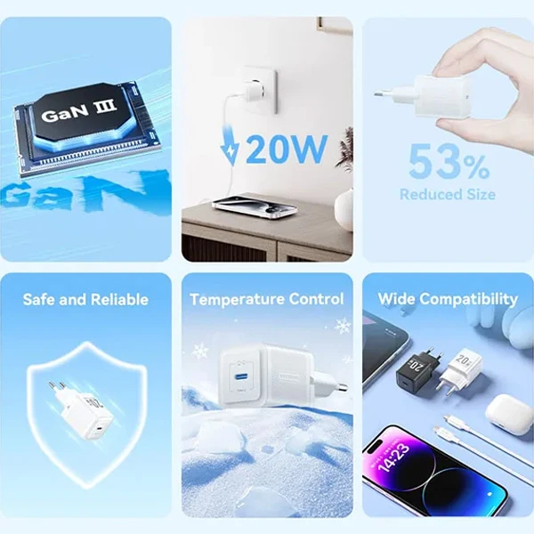 Tired of slow charging and bulky chargers? The Vention 20W GaN Charging Kit is here to supercharge your life. Powered by advanced GaN III technology, this tiny powerhouse packs lightning-fast charging, 8+ safety protections, and universal compatibility—all in one sleek design. Perfect for your smartphone, tablet, or any USB-C device, it’s the ideal charger for your busy lifestyle.